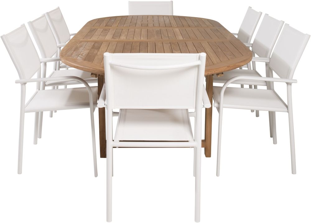 Matgrupp med ett bord och 8 stycken stolar. Stolarna är tillverkade av Aluminium/Textilene och bordet är tillverkat av Teak. Stolarna är stapelbara.