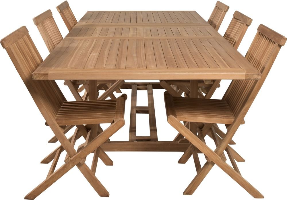 Matgrupp med ett bord och 6 stycken stolar. Stolarna är tillverkade av Teak och bordet är tillverkat av Teak.