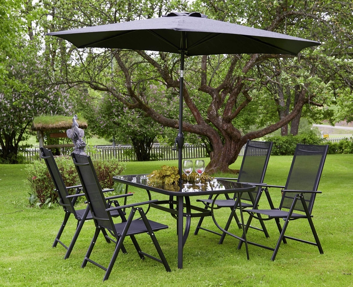 Easy Living By Martinsen, Stilren och praktisk matgrupp i svartlackat utförande med bord, 4 st positionsstolar och parasol, allt i ett paket. Toppskivan på bordet är av härdat glas. Aluminiumstomme i bord och stol.