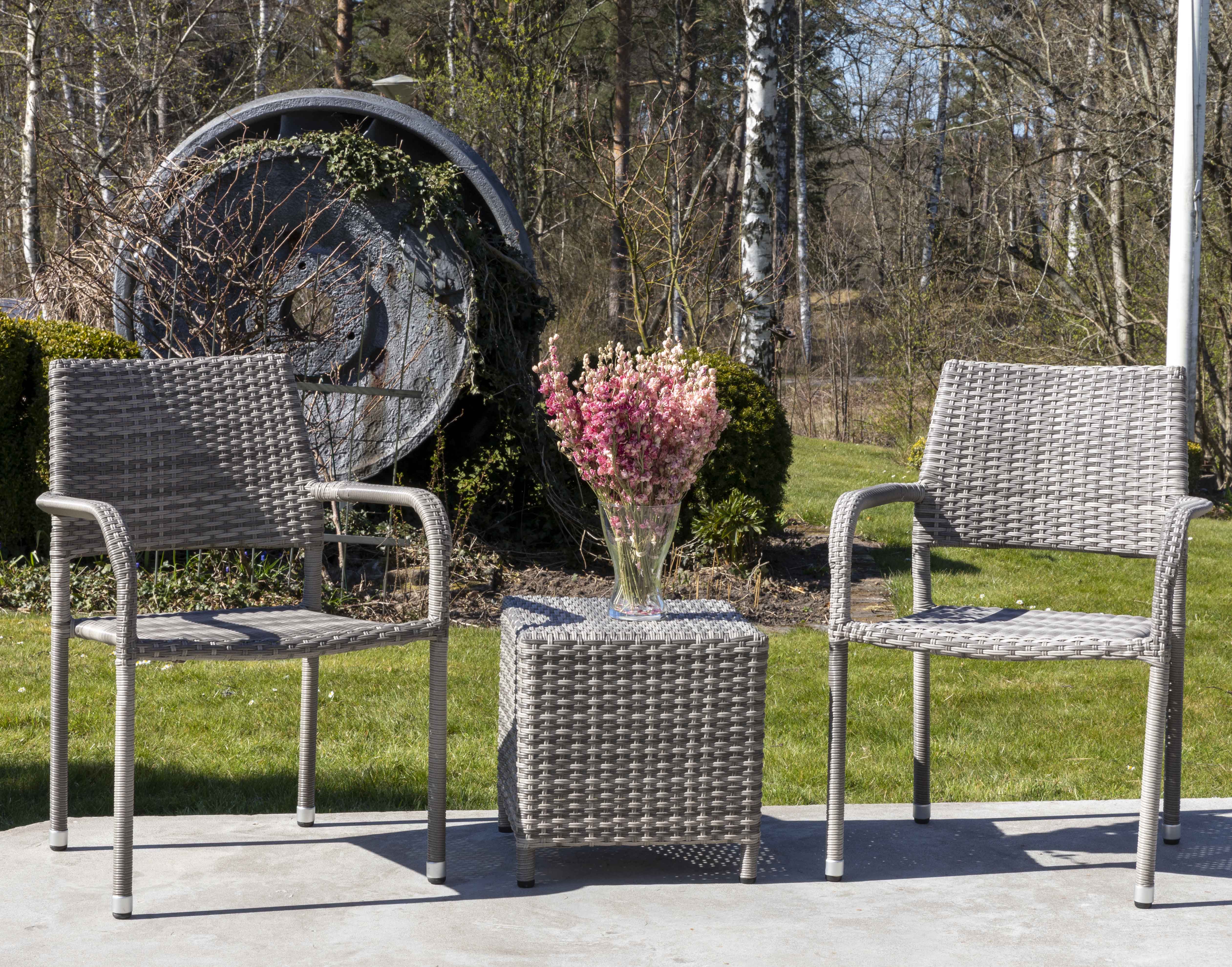 Fåtöljset Bobby med två stapelbara fåtöljer och ett sidobord, allt i matchande gråmelerad konstrotting. Passar bra för avkoppling ute på balkongen, terrassen etc.