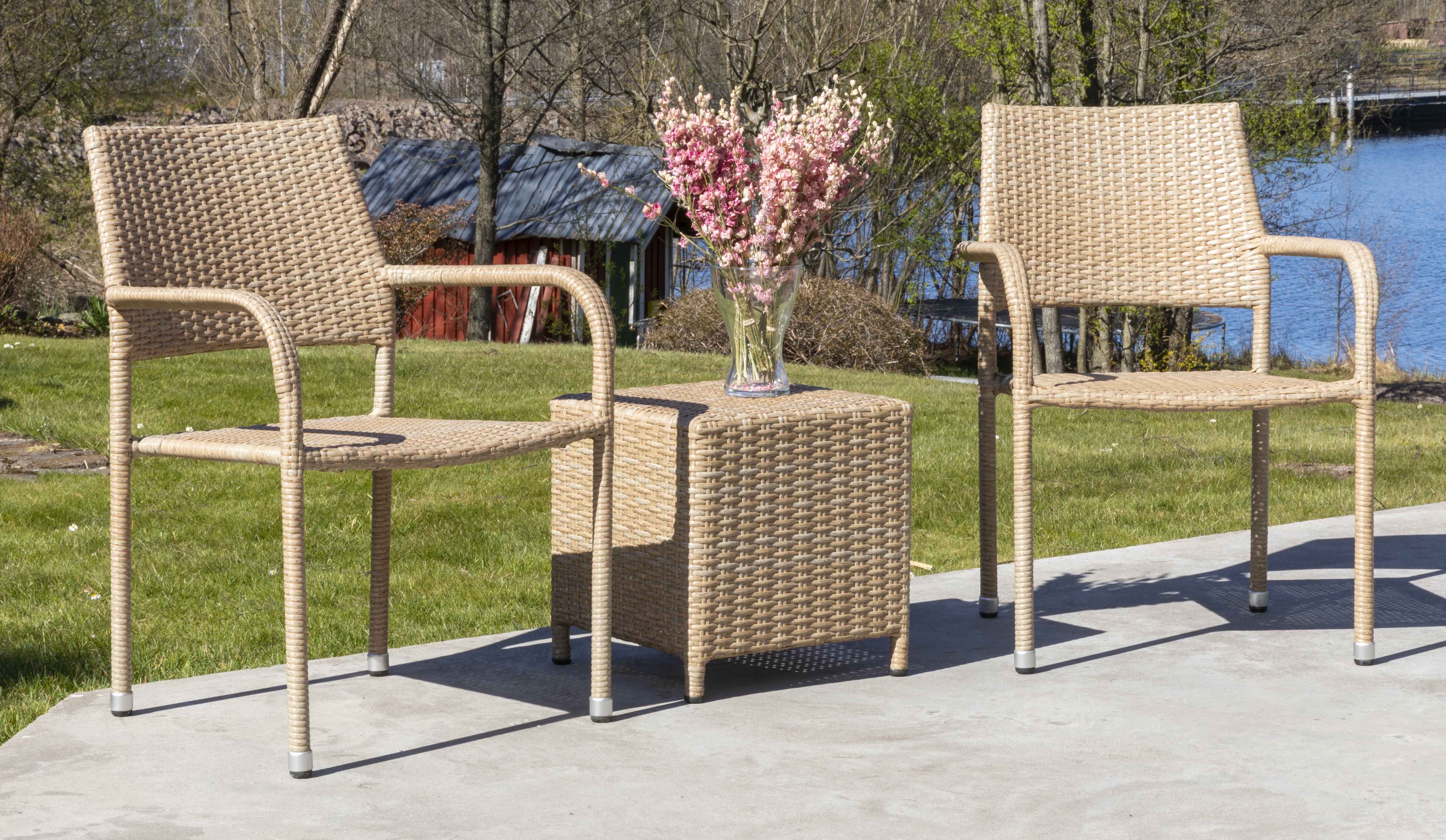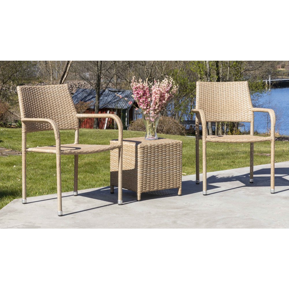 Fåtöljset Bobby med två stapelbara fåtöljer och ett sidobord, allt i matchande naturfärgad konstrotting. Passar bra för avkoppling ute på balkongen, terrassen etc.