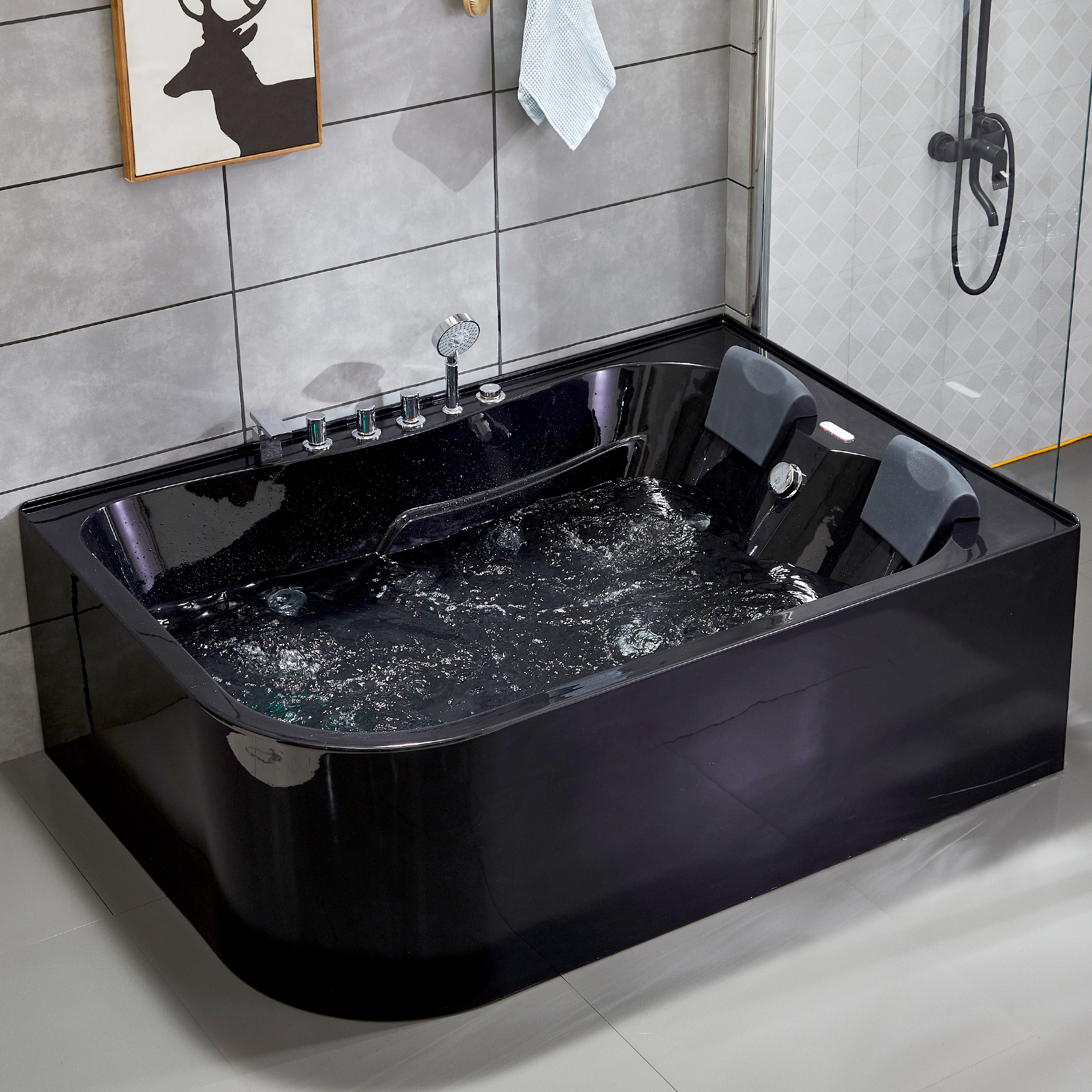 Bubbelbadkar för två i modern, svart design för placering intill vägg. Badkaret finns för placering längs både höger- och vänstervägg. För högsta hållbarhet är karet tillverkat i 100% ren, slitstark högkvalitetsakryl. Akryl är ett material som isolerar bra och därmed håller värmen på badvattnet länge. Materialet porfritt vilket ger en mjuk och len yta i badkaret. Den släta ytan är väldigt lätt att göra ren.