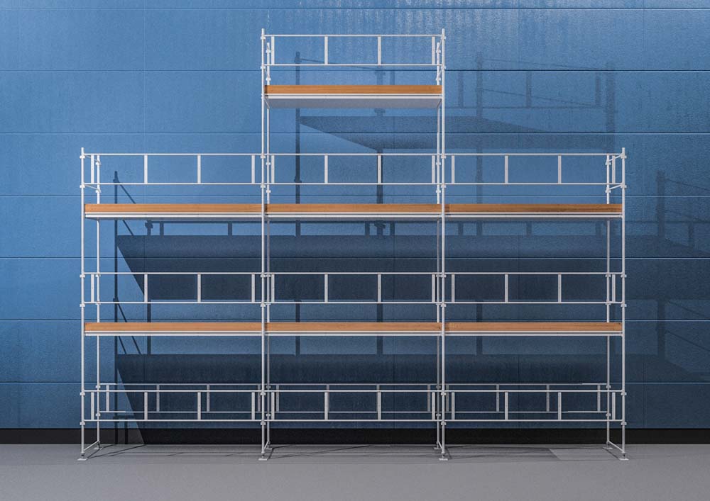 HAKI Ram har en enkel konstruktion som har snabbmonterade, slutna ramar. De lätta aluminiumplanen är staplingsbara och de självstagande skyddsräcksramarna kräver inget diagonalstag. Detta gör att det går snabbt att få ställningen på plats.