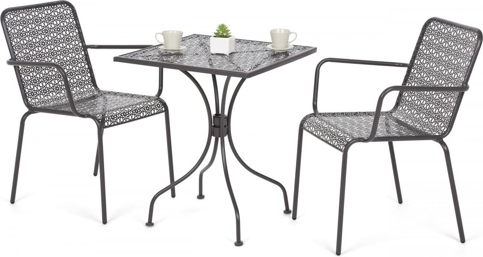 Klassisk cafégrupp med bord och två stolar tillverkade i pulverlackerad stål.