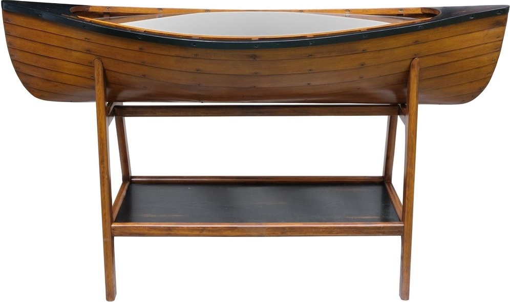 Konsolbord i form av en båt. Tillverkad av massiv furu, målad som en klassisk båt. Glasskiva täcker båten där man kan ställa prydnadssaker.