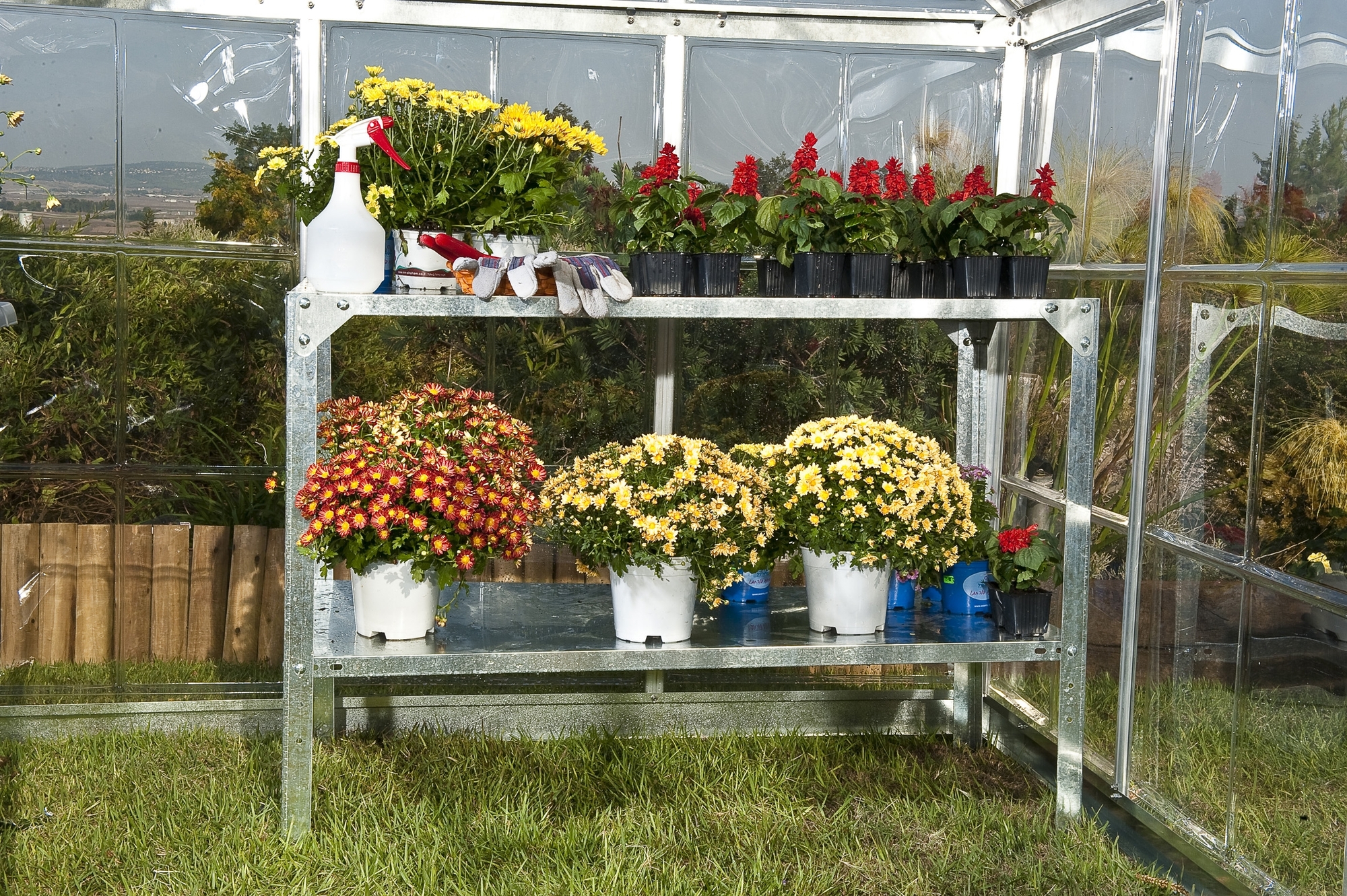Den justerbara arbetsbänken i metall med 2 nivåer är det perfekta hyllsystemet för att organisera ditt växthusutrymme. Den ger dig ett arbetsområde för odling med en förvaringshylla under. Den kan också fungera i ditt skjul, garage, trädgård osv. De två hyllorna ger gott om förvaring och arbetsutrymme och tillåter tung viktbelastning. Den nedre hyllans höjd kan justeras för att uppfylla dina trädgårdsbehov. Den är underhållsfri och en av dess främsta fördelar är den övre hyllans dubbla användning; som en hylla för vardagliga trädgårdsarbeten eller om den placeras upp och ner som en jordbricka. Den här bänken är tillverkad av slitstarkt galvaniserat stål, den är portabel och lätt att montera, och den kan flyttas var som helst när det passar dig.