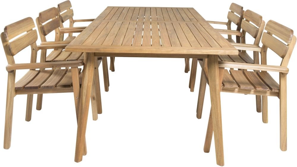 Matgrupp med ett bord och 6 stycken stolar. Stolarna är tillverkade av Akacia och bordet är tillverkat av Akacia. Stolarna är stapelbara.