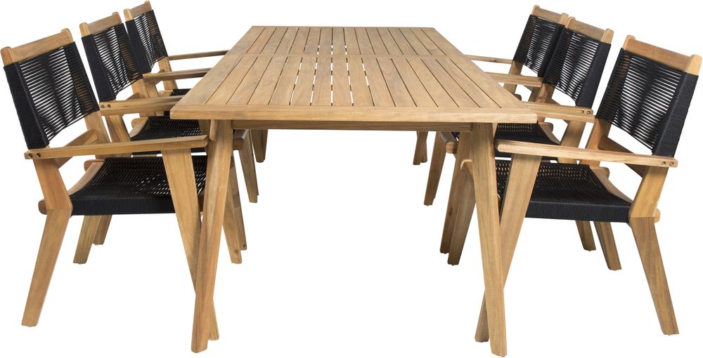 Matgrupp med ett bord och 6 stycken stolar. Stolarna är tillverkade av Akacia/Rep och bordet är tillverkat av Akacia.