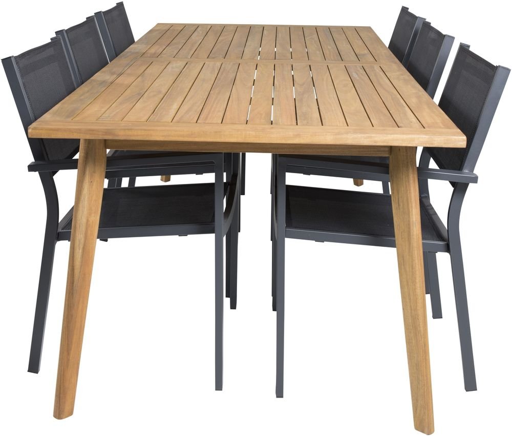 Utegrupp Charlottenberg har en enkel design med bord i naturskönt akaciaträ och stolar i svart aluminium och textilene. Materialen kontrasterar fint mot varandra och ger en tuff samtidigt som varm känsla. Inkluderat är ett rejält bord med modern look och ben som sticker ut lite käckt. Bordet är 220 cm långt och tillsammans med de 6 st karmstolarna perfekt för härliga långa middagar.