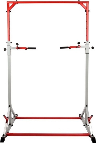Handtagen för dips är både halkfria och justerbara i höjd och avstånd. Den övre stången går att justera i höjd i intervallet 158-233 cm. För övrigt är träningsställningen lätt att installera och kräver ingen montering i vägg eller tak eftersom den är helt fristående.