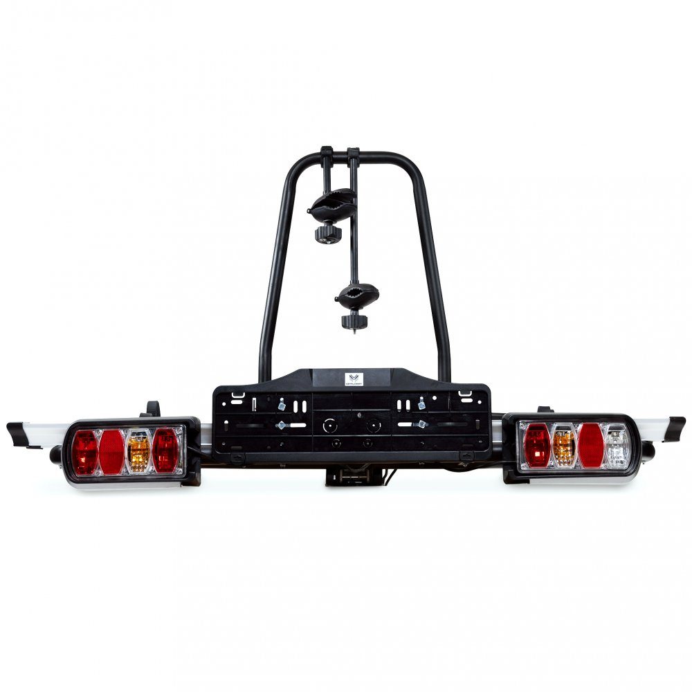 Denna cykelhållare är särskilt utvecklad för att klara den högre vikten hos elcyklar. Den rymmer två cyklar med en total lastkapacitet på 60 kg och är utrustad med baklyktor för säker transport även i mörker. Tack vare den integrerade låsfunktionen är både cyklarna och själva hållaren skyddade mot stöld.