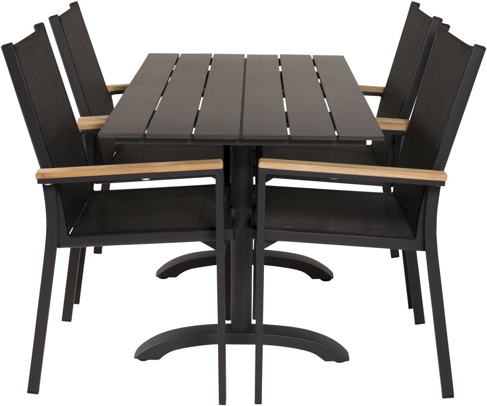 Matgrupp med ett bord och 4 stycken stolar. Stolarna är tillverkade av Teak/Aluminium/Textilene och bordet är tillverkat av Aintwood/Aluminium. Stolarna är stapelbara. Dynor ingår.