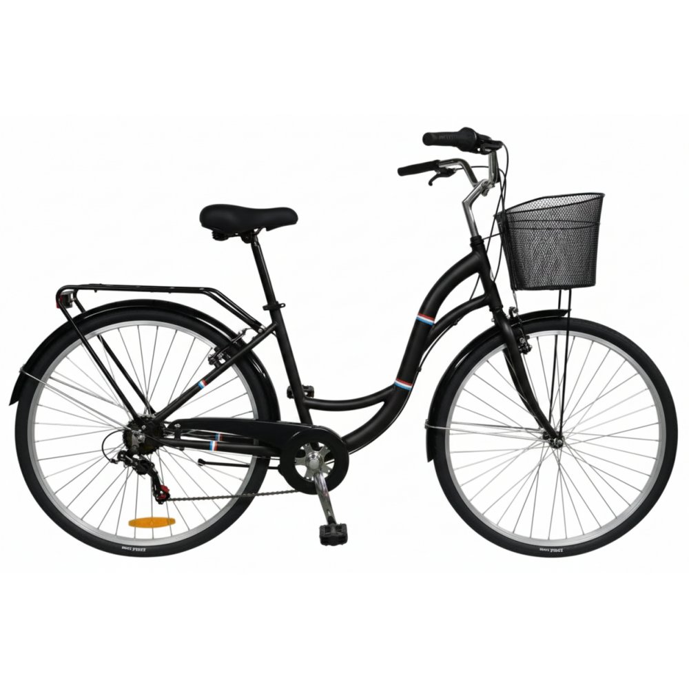 Den praktiska framkorgen i plast ger plats för väskan eller inköp, och den bakre pakethållaren gör det enkelt att fästa extra last. Med stänkskärmar i stål, kedjeskydd och stöd håller du både dig själv och cykeln ren under färd. Den justerbara sadeln och styret gör det lätt att hitta en bekväm position, oavsett längd.