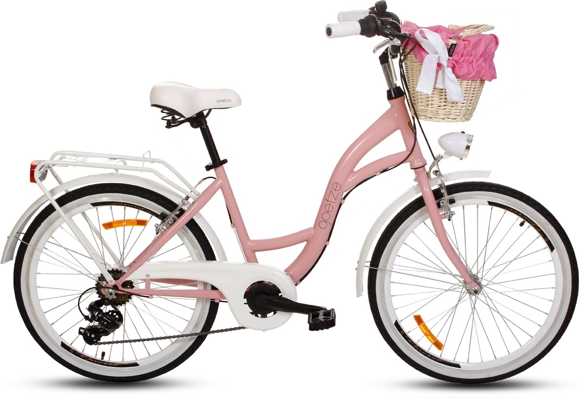 Klassisk damcykel för unga. Cykeln kommer med alla bekvämligheter man kan förvänta sig, så som LED lykta, pakethållare, 6 växlar, kjedjeskydd och en söt flätad korg. Passar utmärkt för transport runt i tätorter. Cykeln har en bekväm o fjädrad sadel som underlättar och håller användaren bekväm under längre sträckor.