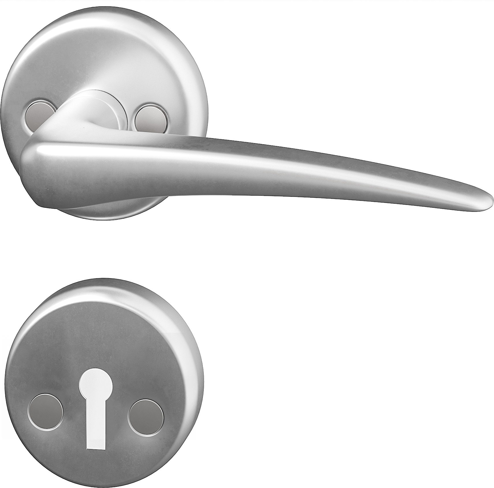 Handtag och nyckelskylt i modernt utförande, till innerdörrar. Setet är tillverkat i aluminium.