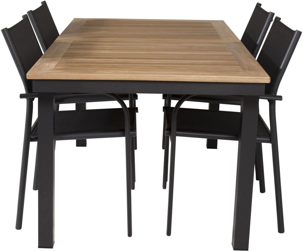 Matgrupp med ett bord och 4 stycken stolar. Stolarna är tillverkade av Aluminium/Textilene och bordet är tillverkat av Teak/Aluminium. Stolarna är stapelbara.