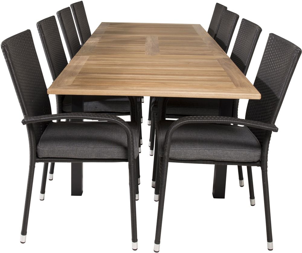 Matgrupp med ett bord och 8 stycken stolar. Stolarna är tillverkade av Konstrotting/polyester och bordet är tillverkat av Teak/Aluminium. Dynor ingår.