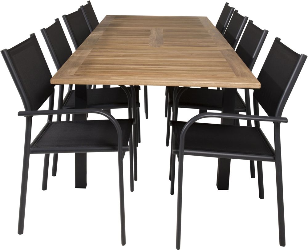 Matgrupp med ett bord och 8 stycken stolar. Stolarna är tillverkade av Aluminium/Textilene och bordet är tillverkat av Teak/Aluminium. Stolarna är stapelbara.