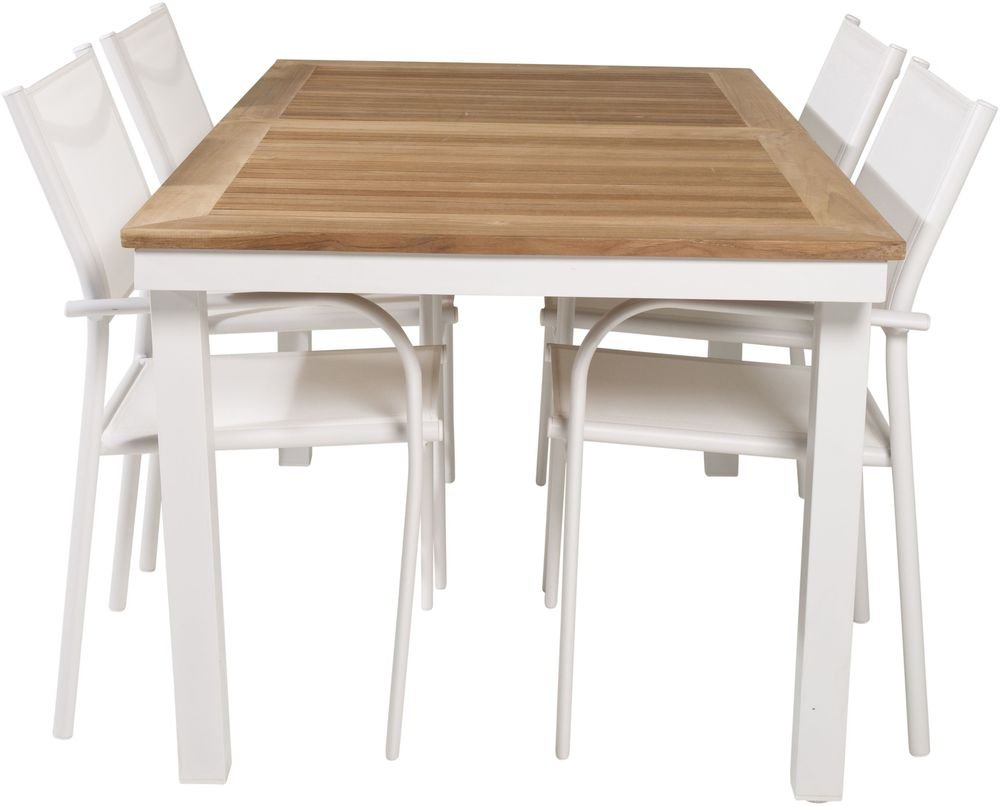 Matgrupp med ett bord och 4 stycken stolar. Stolarna är tillverkade av Aluminium/Textilene och bordet är tillverkat av Teak/Aluminium. Stolarna är stapelbara.