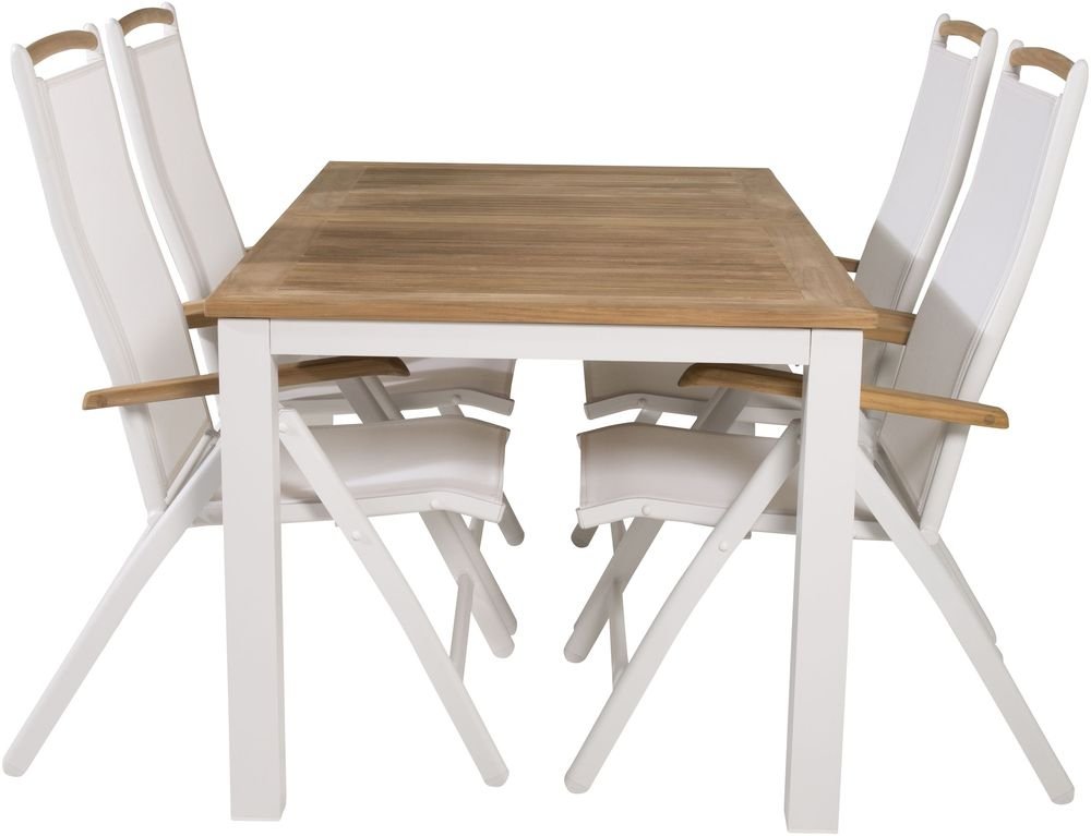 Matgrupp med ett bord och 4 stycken stolar. Stolarna är tillverkade av Teak/Aluminium/Textilene och bordet är tillverkat av Teak/Aluminium.