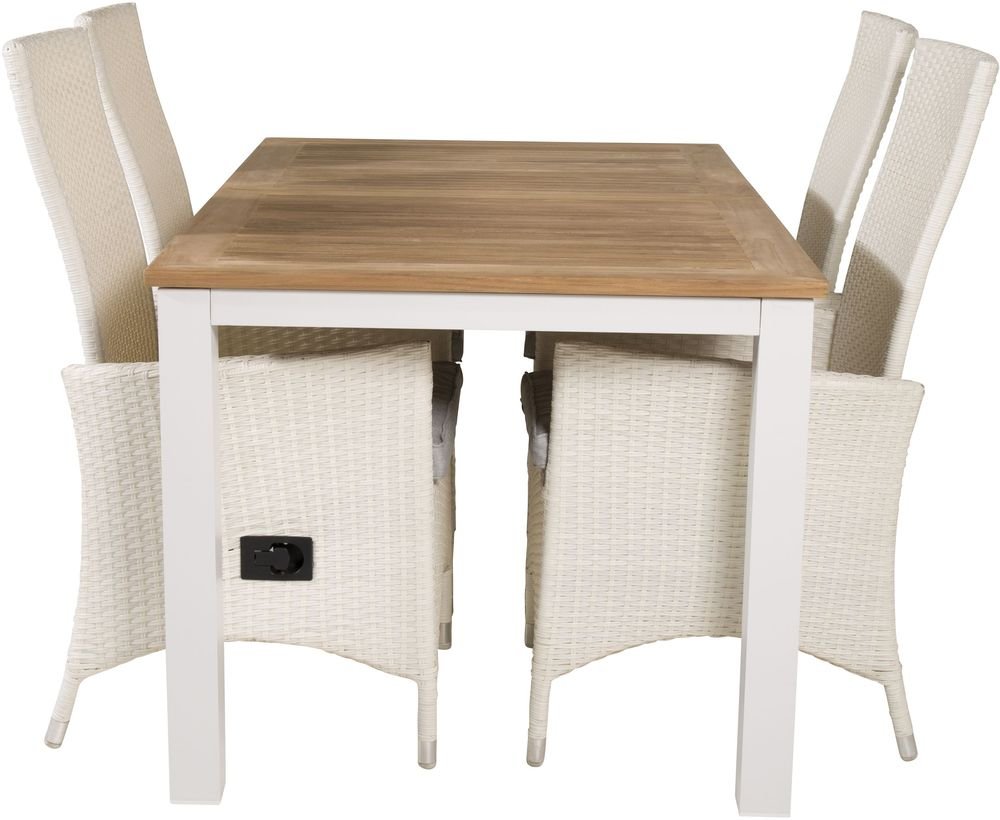 Matgrupp med ett bord och 4 stycken stolar. Stolarna är tillverkade av Konstrotting/Aluminium och bordet är tillverkat av Teak/Aluminium. Dynor ingår.