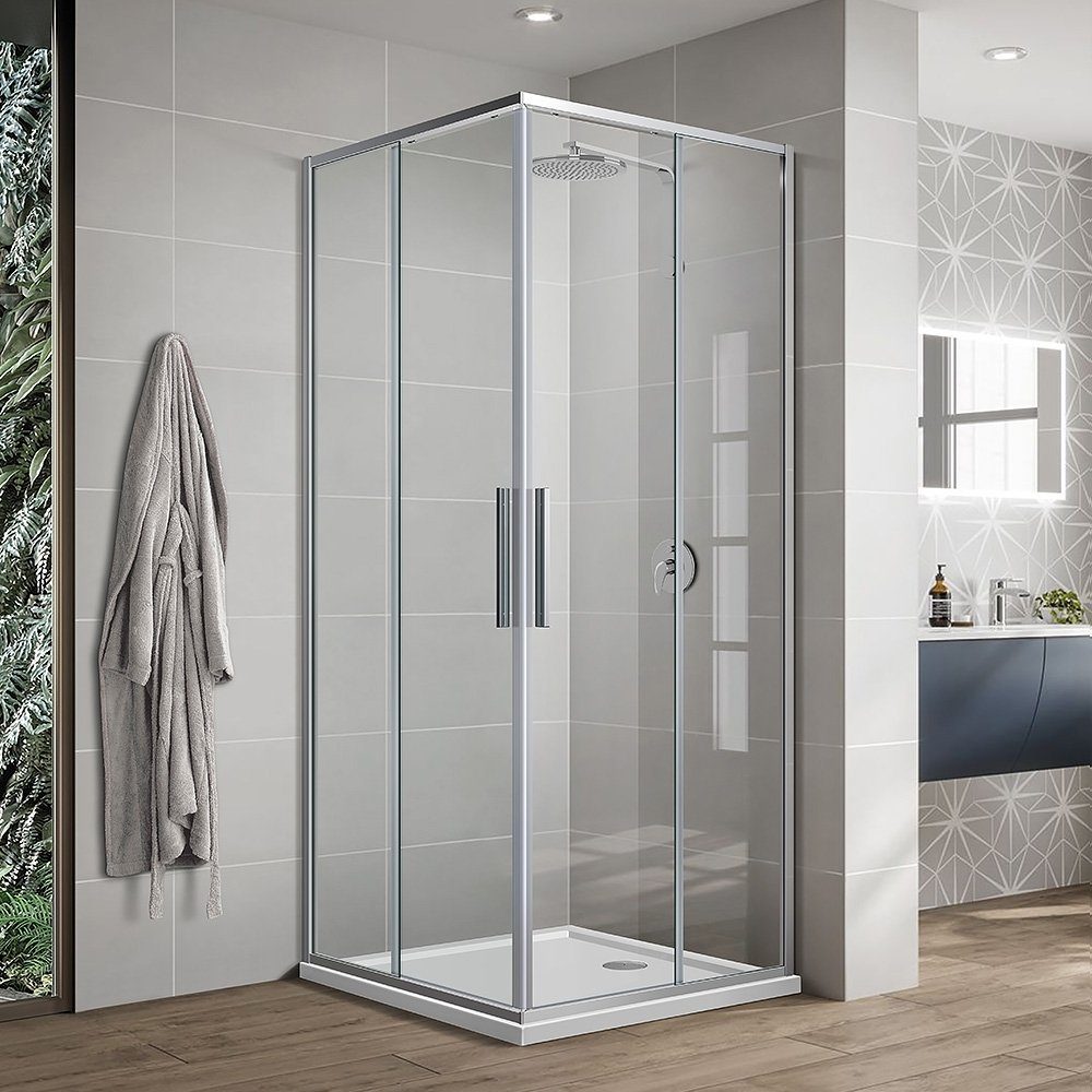 Duschhörnet Elise kombinerar både modern design med hög funktionalitet. Tillverkade av 6 mm härdat klart glas och utrustade med slimmade aluminiumramar i silverfinish, passar dessa duschkabiner perfekt in i alla badrumsmiljöer. Med två skjutdörrar och två fasta paneler erbjuder de en praktisk lösning för både stora och små badrum.