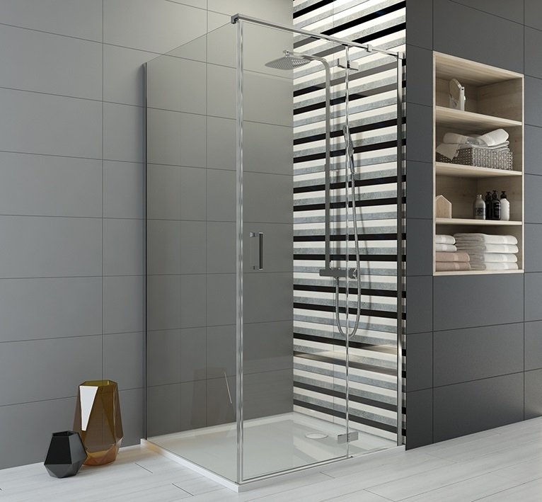 Duschhörna med utåtgående dörr. Glaspartier i duschhörnan är tillverkad av 6 mm säkerhetsglas, glasskyddsbehandlade som standard. Glasskyddet GLASS PROTECT är en ytbehandling som gör att vattnet lättare rinner av och lämnar mycket lite kalk och smutsrester efter sig. Tät dörrstängning garanteras av magnetiska dörrlister. Höjd 200 cm. Modellen finns i flera storlekar.