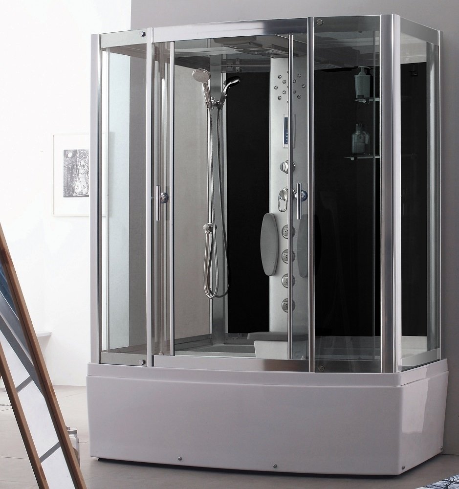 OBS: Duschkabinen har klart härdat glas framtill och på sidorna. Det bakre partiet har svart, målat härdat glas.