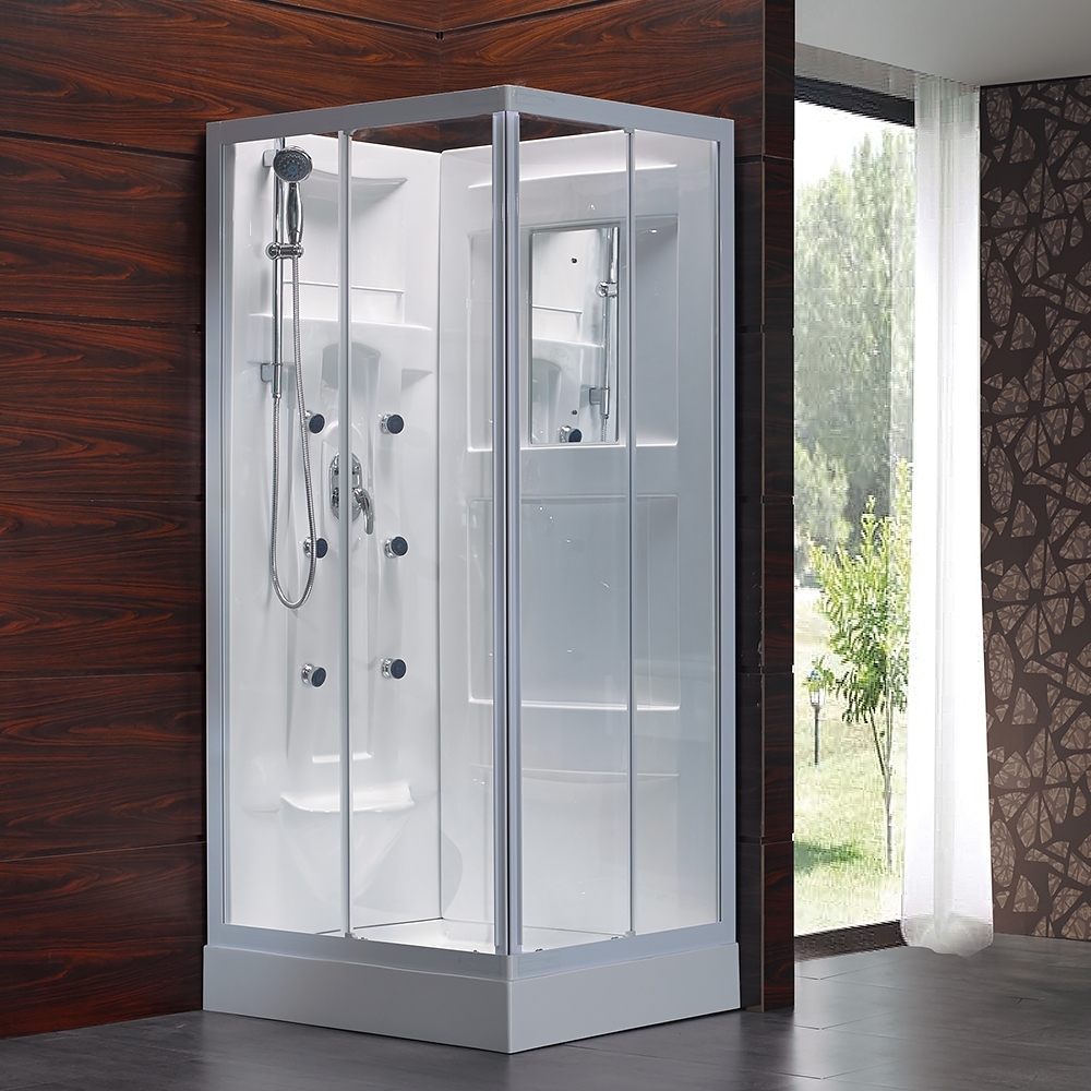 Fronten är gjord av 5 mm härdat glas, vilket ger både säkerhet och en stilren design. Njut av 6 massagejets som ger en härlig och avkopplande massage under duschen. Smidig och enkel att använda, vilket ger dig full kontroll över vattentemperaturen. Flexibel användning för både duschning och rengöring av kabinen. Kabinen kommer även med en hylla för förvaring av dina duschprodukter samt en spegel som erbjuder en bekväm lösning för en snabb inspektion innan du lämnar badrummet. Med måtten 800 x 1000 x 2100 mm ger duschkabinen tillräckligt med utrymme för en bekväm duschupplevelse.
