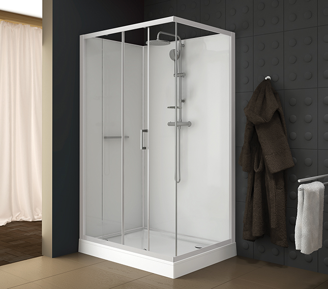 Komplett duschkabin med skjutdörr. Ingår: blandare, takdusch, handdusch och liten dusch-hylla för toalettartiklar och dylikt. Ingår gör även golvbrunn i kabinen samt rör / vattenavrinning från denna. Glaspartierna i duschkabinen är tillverkad av härdat säkerhetsglas med glasskydd som standard-alternativ. Glasskyddet GLASS PROTECT är en ytbehandling som gör vattnet lättare rinner av och lämnar mycket lite kalk och smutsrester efter sig. Dörrsmekanism med tät dörrstängning som garanteras av magnetiska dörrlister.