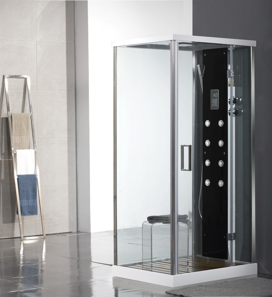- Duschgolv och tak i PMMA och ABS med sidostycken i rostfritt stål och insida med trägolv