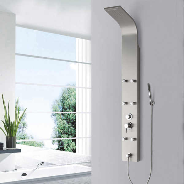 Silverfärgad duschpanel med takdusch, ryggdusch och handdusch.