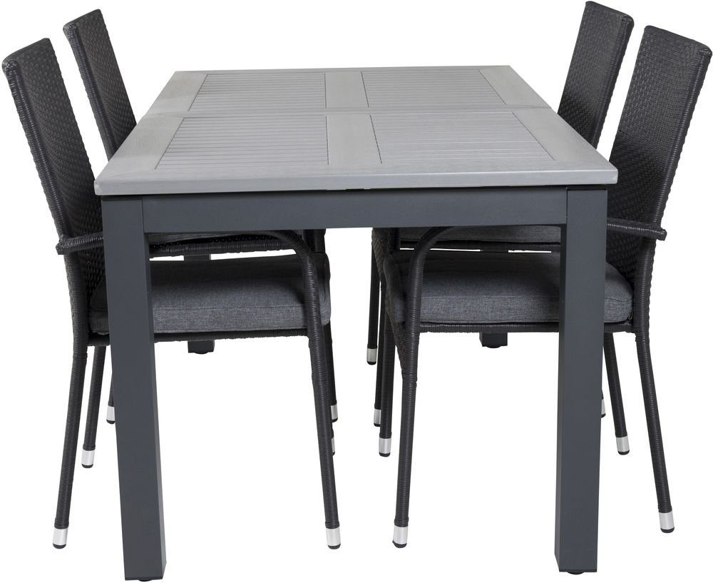 Matgrupp med ett bord och 4 stycken stolar. Stolarna är tillverkade av Konstrotting/polyester och bordet är tillverkat av Aintwood/Aluminium. Dynor ingår.