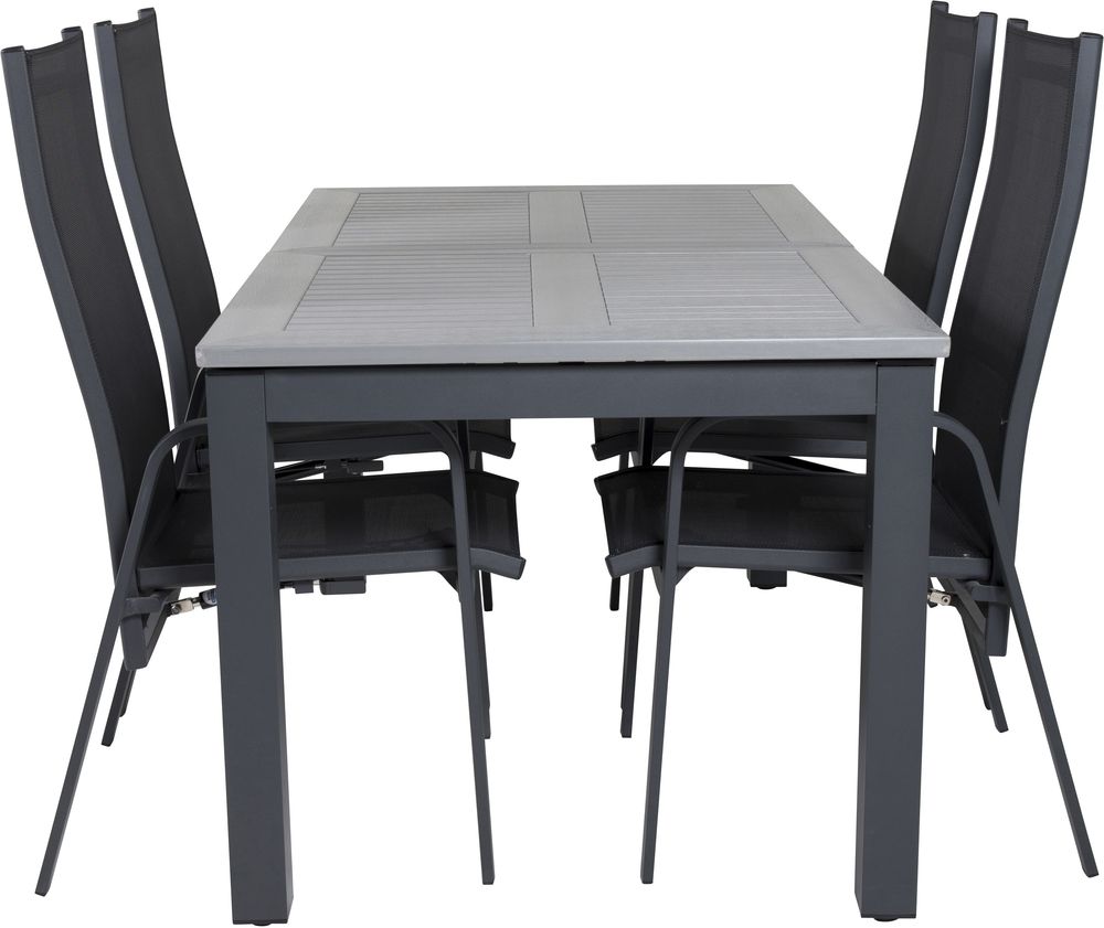 Matgrupp med ett bord och 4 stycken stolar. Stolarna är tillverkade av Aluminium/Textilene och bordet är tillverkat av Aintwood/Aluminium. Stolarna är stapelbara.