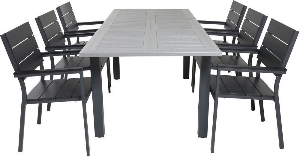 Matgrupp med ett bord och 6 stycken stolar. Stolarna är tillverkade av Aluminium/Polywood och bordet är tillverkat av Aintwood/Aluminium. Stolarna är stapelbara.