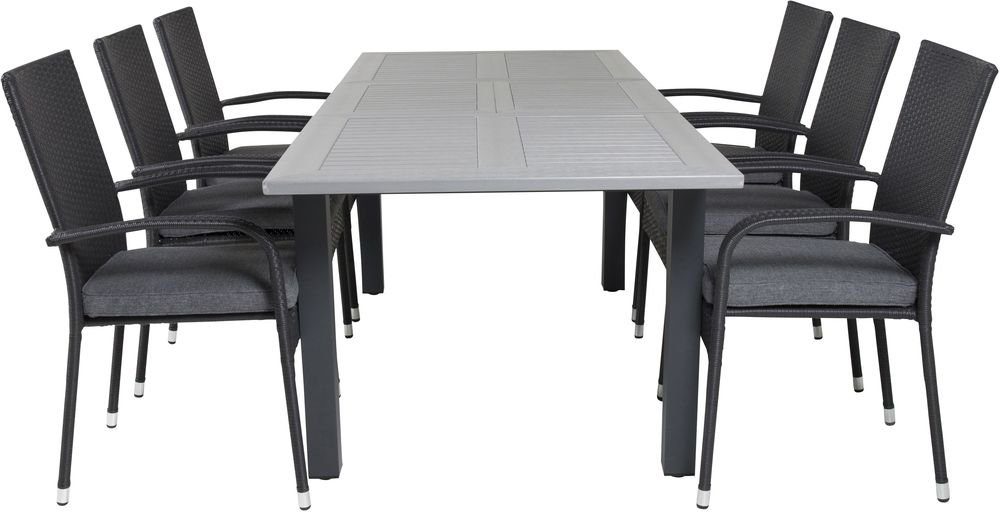 Matgrupp med ett bord och 6 stycken stolar. Stolarna är tillverkade av Konstrotting/polyester och bordet är tillverkat av Aintwood/Aluminium. Dynor ingår.