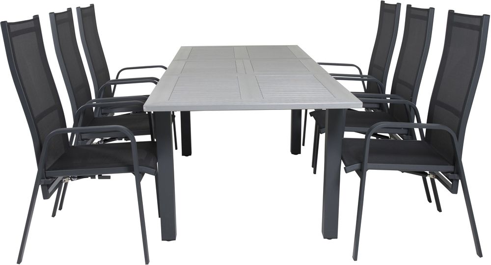 Matgrupp med ett bord och 6 stycken stolar. Stolarna är tillverkade av Aluminium/Textilene och bordet är tillverkat av Aintwood/Aluminium. Stolarna är stapelbara.