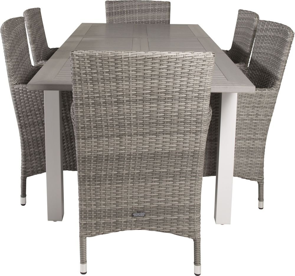Matgrupp med ett bord och 6 stycken stolar. Stolarna är tillverkade av Konstrotting/Aluminium och bordet är tillverkat av Aintwood/Aluminium. Dynor ingår.