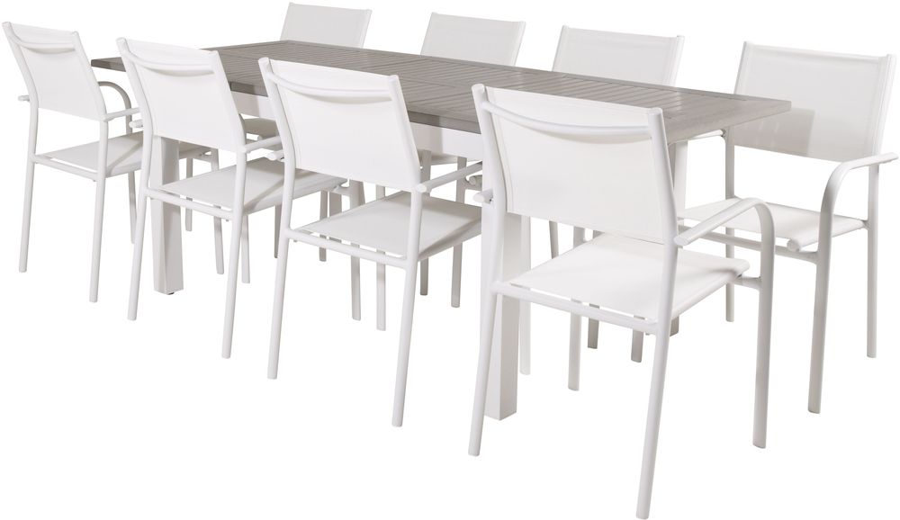 Matgrupp med ett bord och 8 stycken stolar. Stolarna är tillverkade av Aluminium/Textilene och bordet är tillverkat av Aintwood/Aluminium. Stolarna är stapelbara.