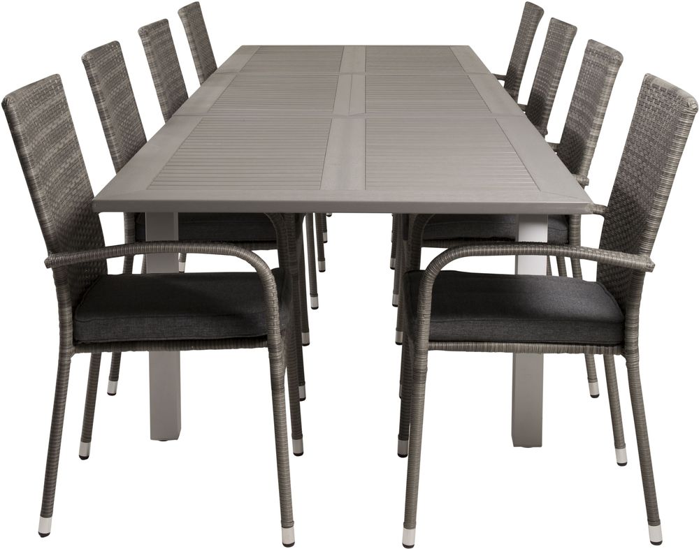 Matgrupp med ett bord och 8 stycken stolar. Stolarna är tillverkade av Konstrotting/polyester och bordet är tillverkat av Aintwood/Aluminium. Dynor ingår.