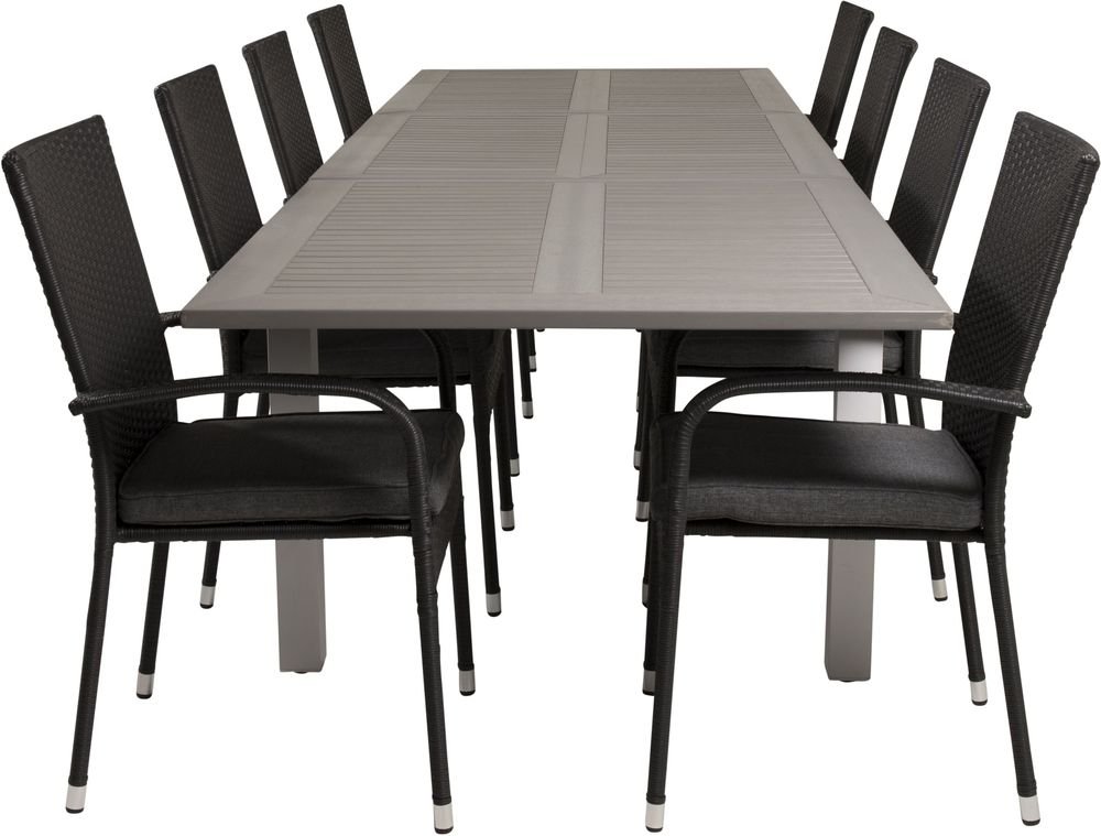 Matgrupp med ett bord och 8 stycken stolar. Stolarna är tillverkade av Konstrotting/polyester och bordet är tillverkat av Aintwood/Aluminium. Dynor ingår.