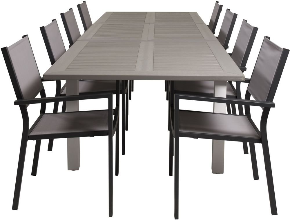 Matgrupp med ett bord och 8 stycken stolar. Stolarna är tillverkade av Aluminium/Textilene och bordet är tillverkat av Aintwood/Aluminium. Stolarna är stapelbara.