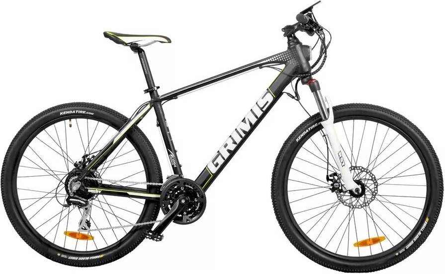 Elcykel Grimis är utrustad med Shimano växlar och bromsarna är skivbromsar av märket Tektro Aries. Framgafflarna är fjädrade med RST-fjädrar som är ställbara.