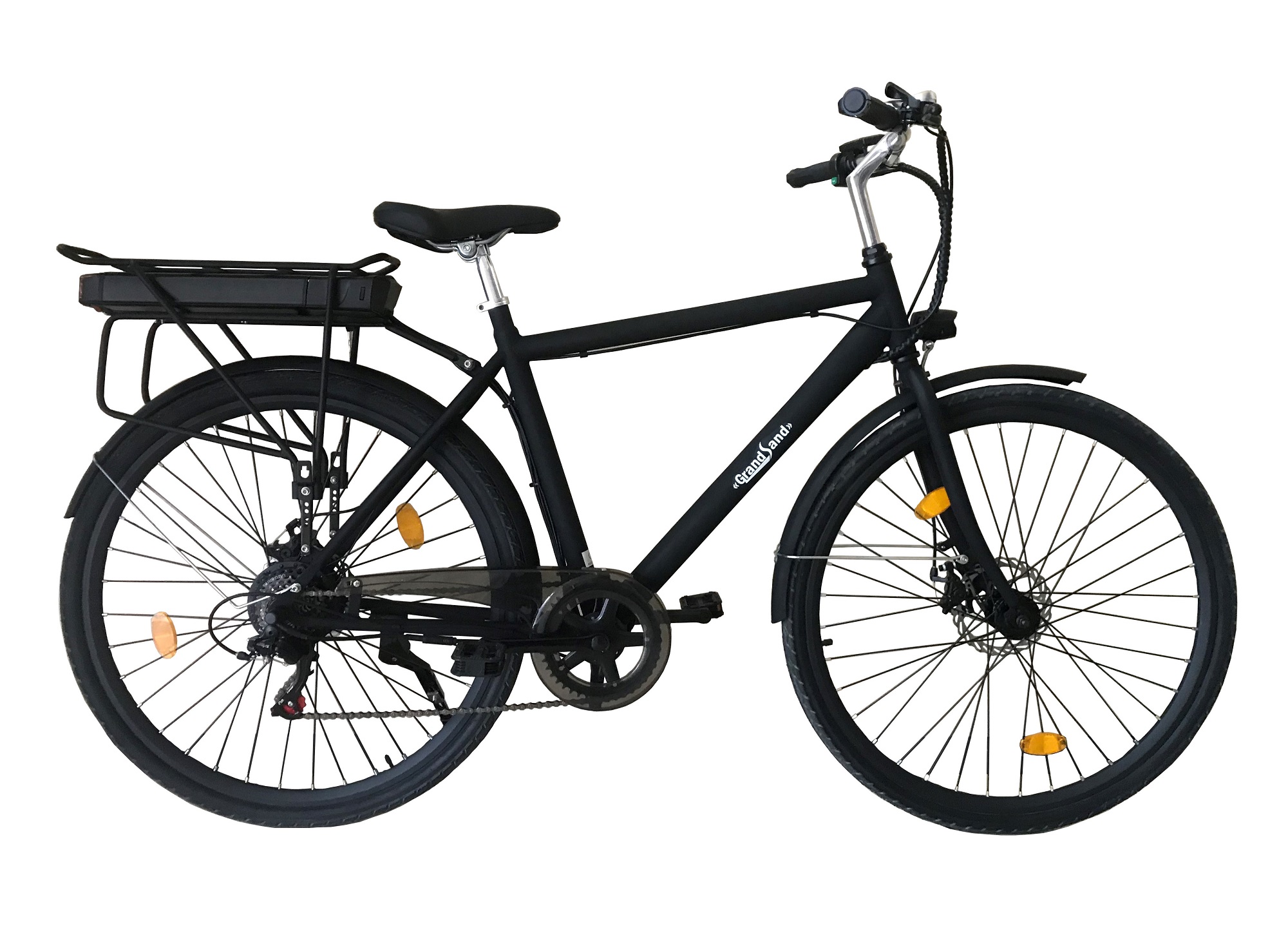Elcykel med en elmotor på 250W, drivs av ett Li-ion batteri på 36 volt och 10 Ah.