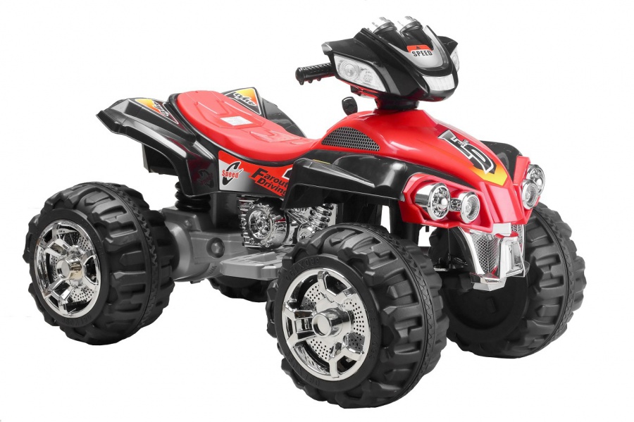 Eldriven fyrhjuling för barn (ålder: 3-8) med fräcka ljudeffekter. Hastighet 3-6 km/h (fram och back). Max belastning 30 kg.