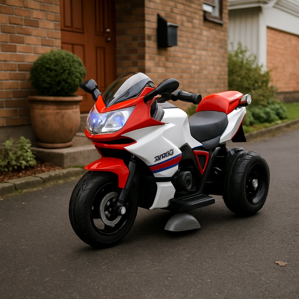 En häftig elmotorcykel i sportig vit/röd design som ger barnen känslan av att köra på riktigt. Med dubbla motorer, LED-ljus och musik via Bluetooth blir åkturen både rolig och verklighetstrogen. Den bakre packboxen ger dessutom praktisk förvaring för leksaker eller småsaker.