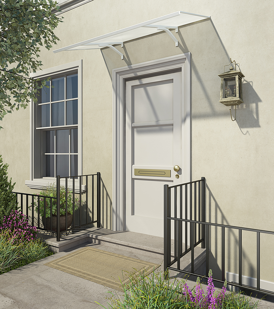 Taket är tillverkat av praktiskt taget okrossbar polykarbonat som ger dig skuggar men ändå släpper igenom den vackra sol du vill ha in genom ytterdörrsfönstret.