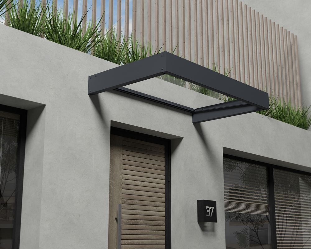Praktiskt skydd för dörrar & fönster. Entrétaket är tillverkat av rostresistent pulverlackerad aluminium och anslutningar av galvaniserat stål. 4 mm tjock polykarbonat takpanel som är praktiskt taget okrossbar. Integrerad vattenränna. Simpel DIY montering med tillhörande väggfästen för betong eller massiva tegelväggar.