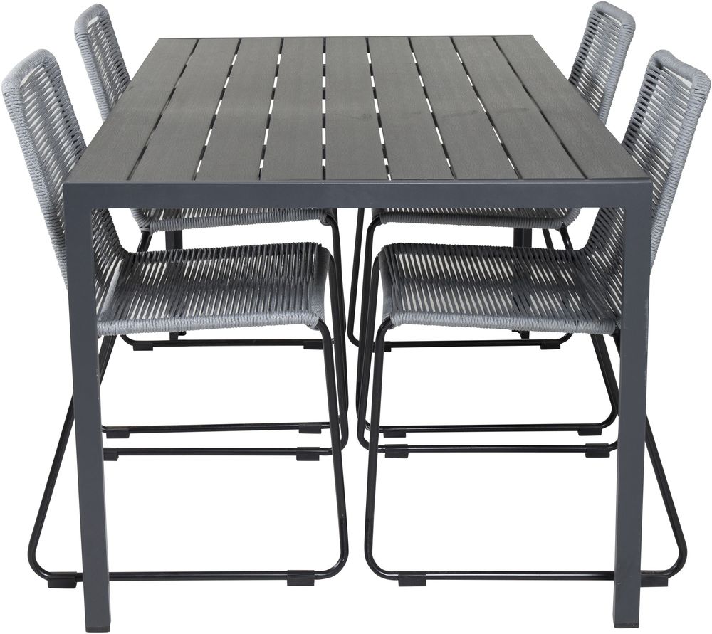 Matgrupp med ett bord och 4 stycken stolar. Stolarna är tillverkade av Stål/Rep och bordet är tillverkat av Polywood/Aluminium. Stolarna är stapelbara.