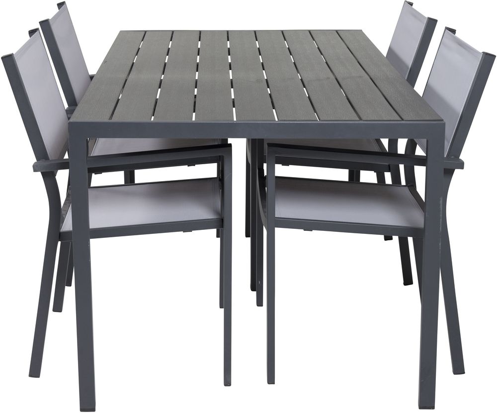 Matgrupp med ett bord och 4 stycken stolar. Stolarna är tillverkade av Aluminium/Textilene och bordet är tillverkat av Polywood/Aluminium. Stolarna är stapelbara.